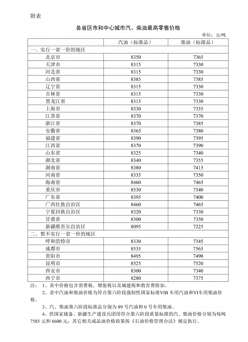 附:各省区市和中心城市汽、柴油最高零售价格
