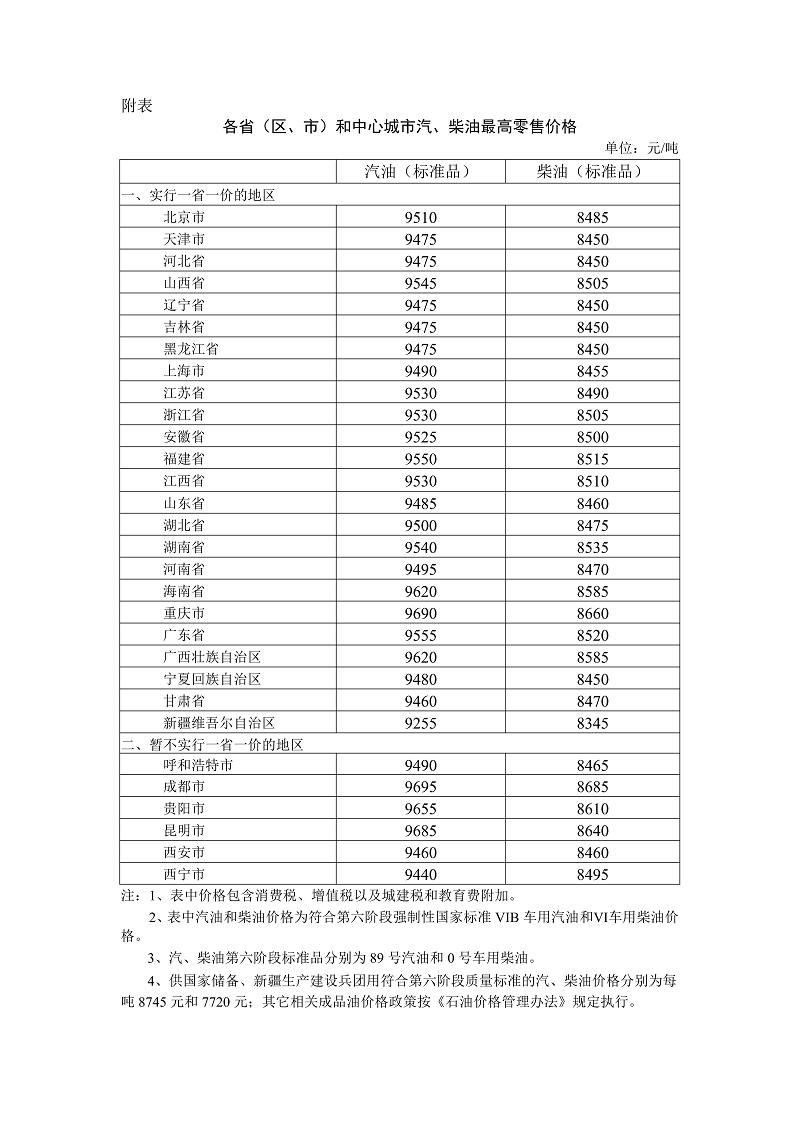 附:各省(区、市)和中心城市汽、柴油最高零售价格